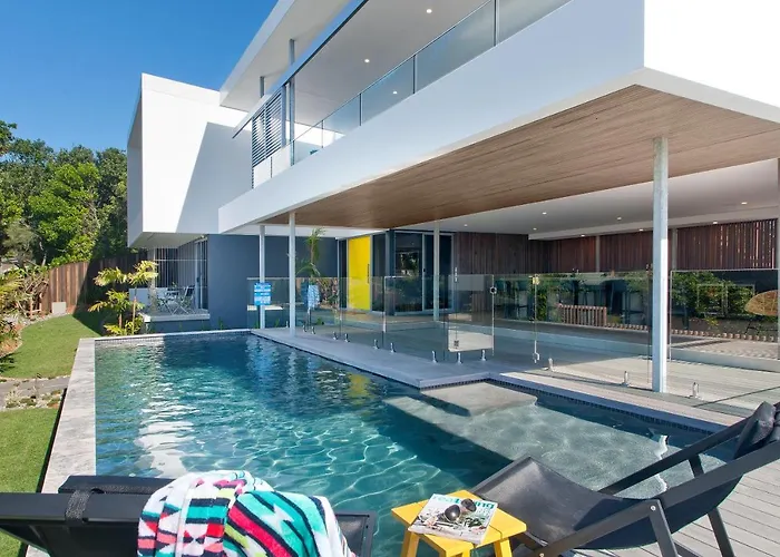 Die 4-Zimmer- Bluey'S Beach House - 5 Bedroom liegt 30 Meter vom Strand (Sunshine Beach) entfernt und bietet Gästen einen Außenpool für einen entspannten Aufenthalt. Diese Villa verfügt über eine private Terrasse mit einem Esstisch.